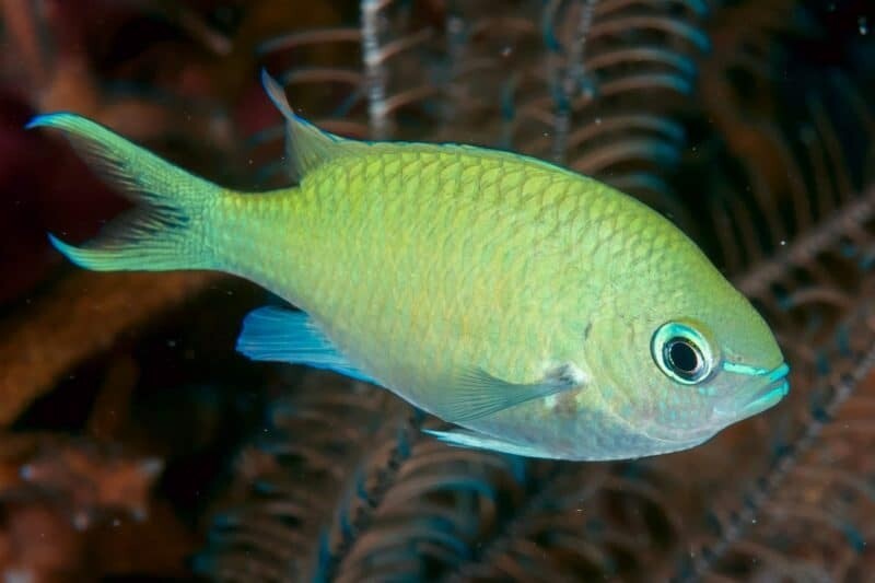 That's a tough one! I haven't seen many rare outstanding fish but my favourite fish are probably blue-green chromis (Chromis chromis). They appear the most beautiful shades of blue or green depending on the light, they're always schooling - sometimes above corals and sometimes inside corals - and the way they move is so mesmerising. I love them for all those reasons but also because typically they're abundant on thriving coral reefs so its always a good sign when you see them.